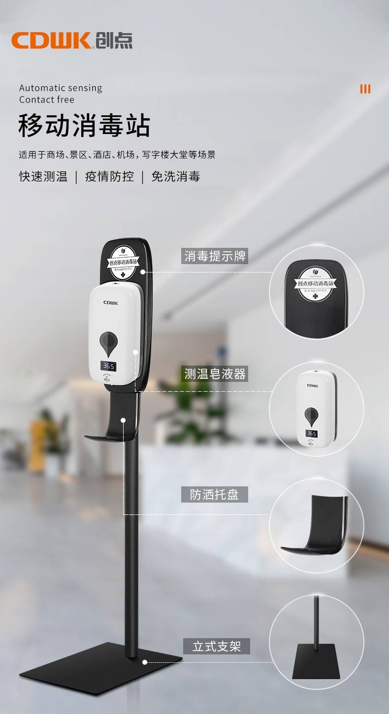 首先在外觀上,CDWK創(chuàng)點自動測溫皂液器采用了經(jīng)典極簡的黑白配色,對比鮮明又簡潔,給人一種大大方方的清爽感覺,極簡高級感油然而生,給人滿滿的舒適感和安全感,無論是放在酒店、商場、學校還是寫字樓,都非常地適合,因為它的外觀可以和眾多設(shè)計風格融為一體,而不會顯得突兀。